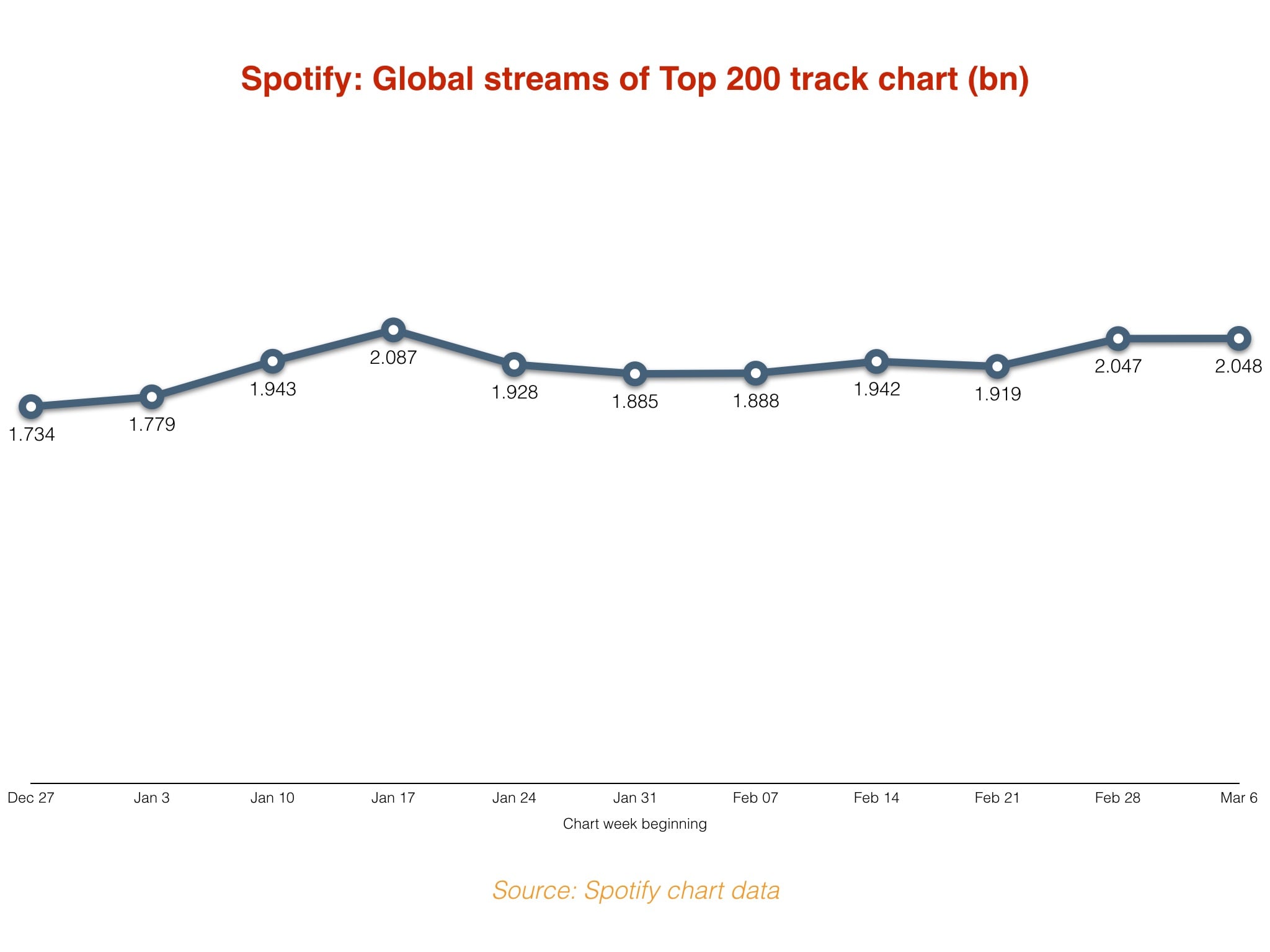There were 2.05bn chart-eligible streams of the Top 200 in the week, according to Spotify’s data.