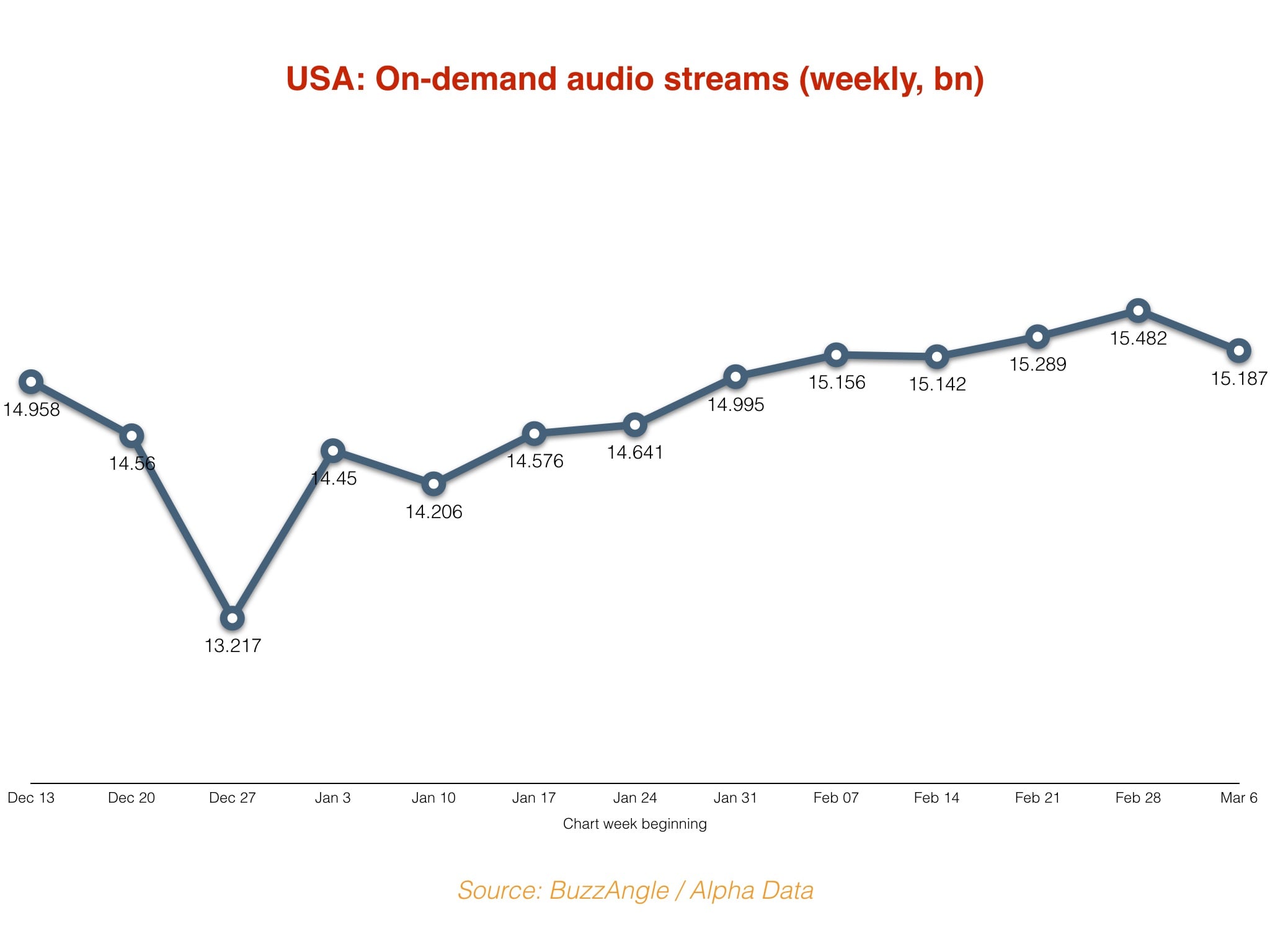 With that in mind, the chart below might bring some extra cheer to the music business. It shows overall audio on-demand streaming volume, week-on-week, in the United States, according to BuzzAngle/Alpha Data – which takes into account plays across Spotify, Apple Music, Amazon Music, YouTube Music (audio) and Pandora, amongst others.