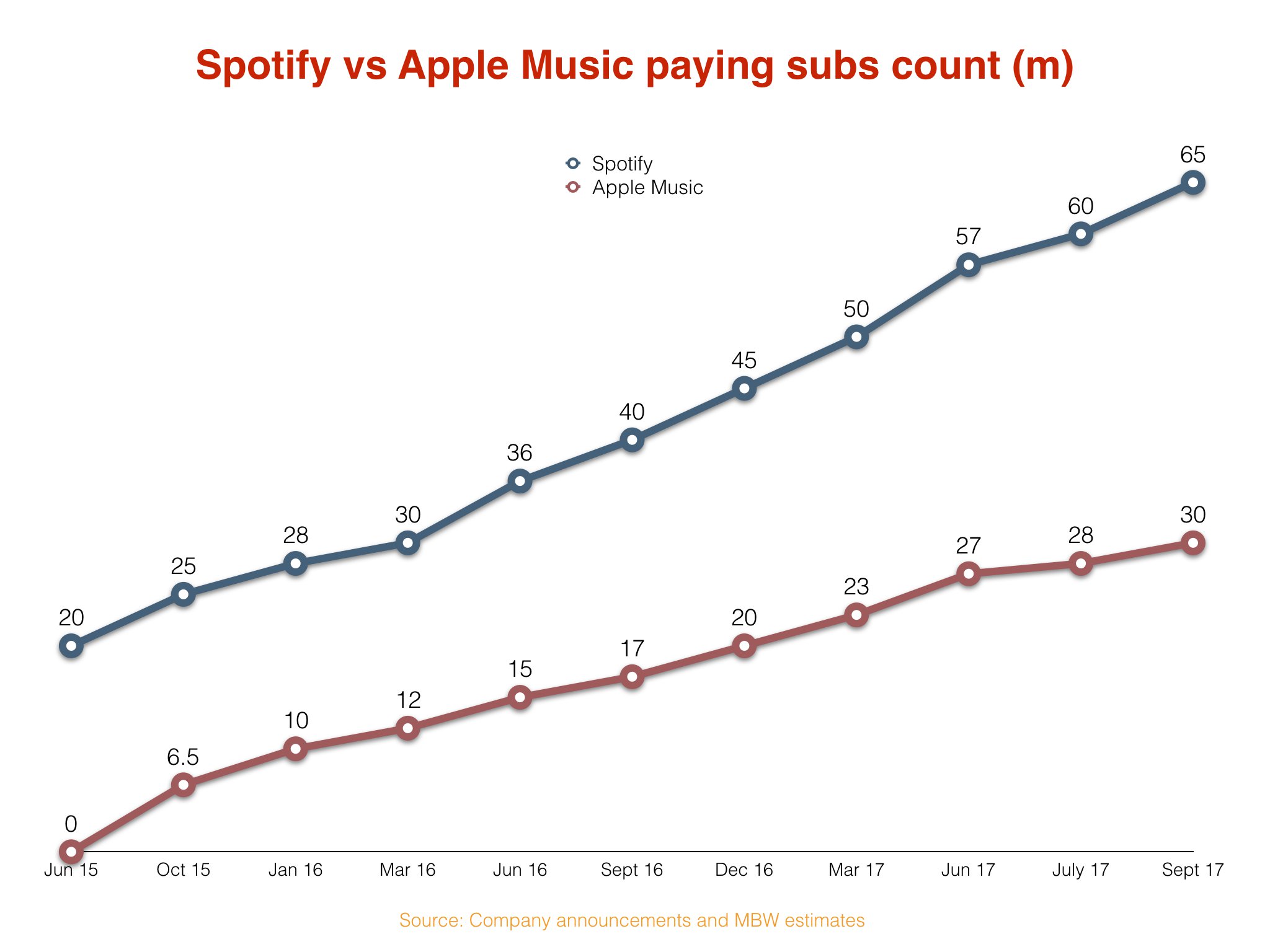 Spotify, meanwhile, last confirmed its paying subscriber number in July, at 60m.