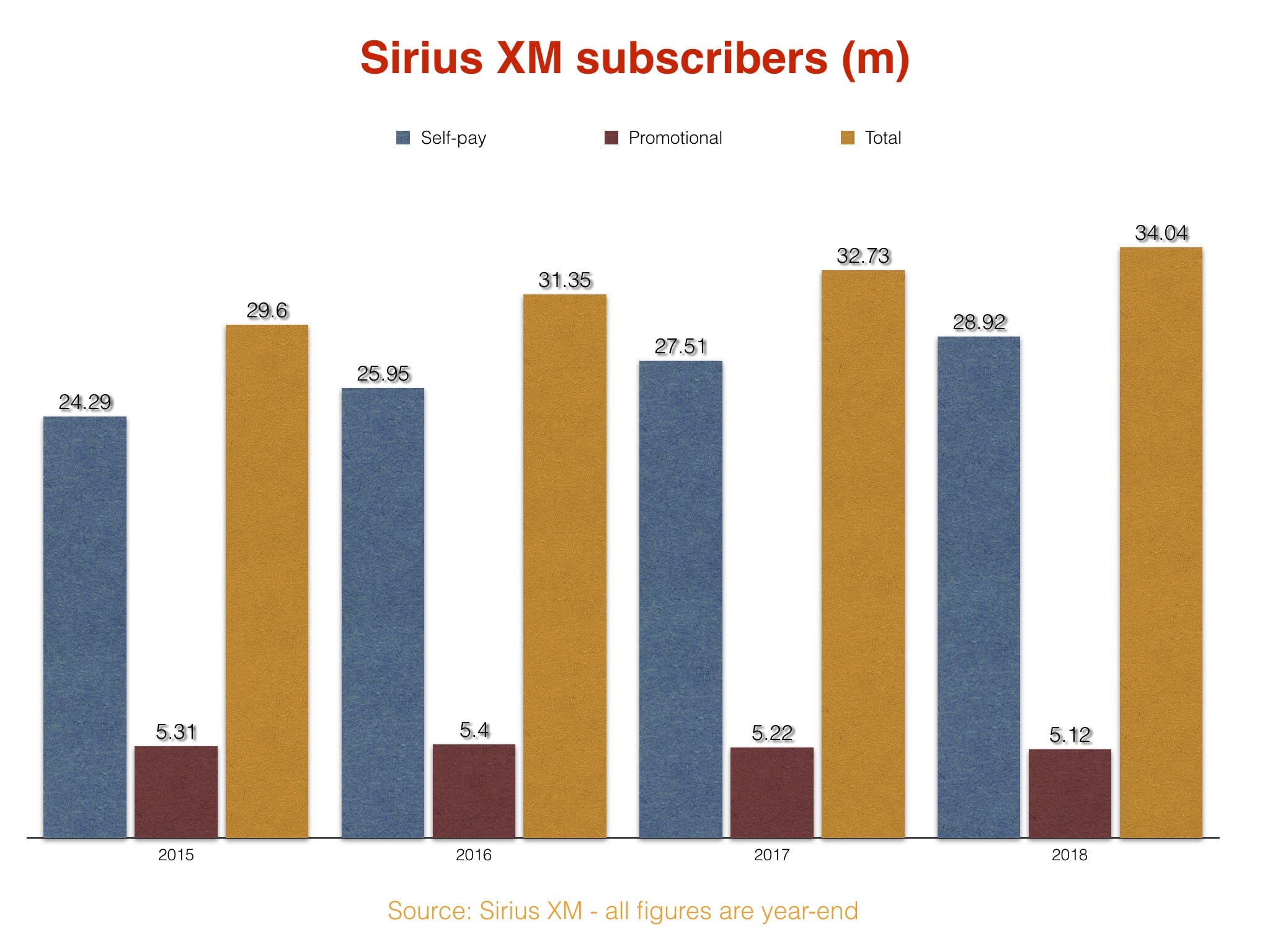 Sirius finished last year with 34m total subscribers, having added 414,000 net ‘self-pay’ subscribers in Q4, and 1.4m across the full year.