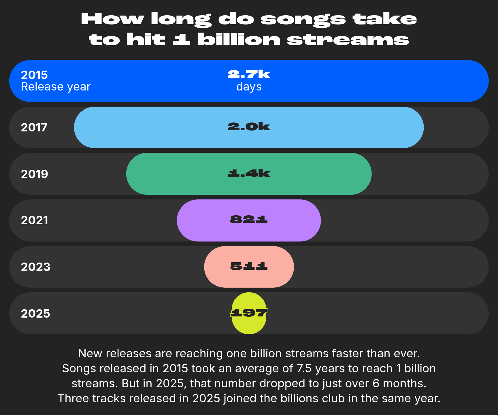 A decade ago, reaching one billion streams was a rare milestone reserved for a handful of tracks. By 2025, the average time to hit that threshold had fallen from 2,729 days in 2015 to just 197 days — a reflection of widening streaming adoption, globalized fanbases, and the growing role of algorithmic discovery.