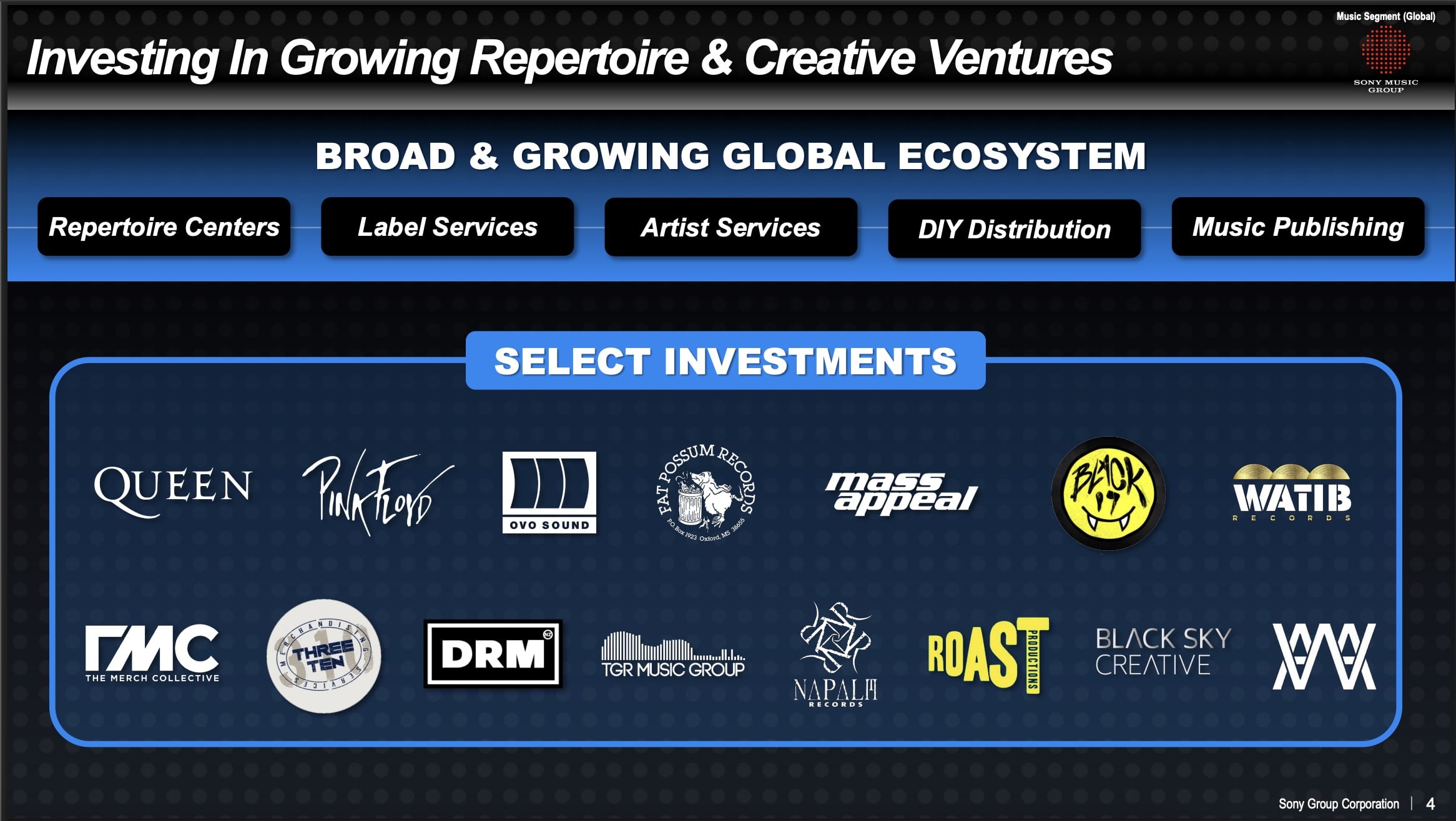 Beyond the Pink Floyd and Queen deals, Stringer’s presentation also highlighted other “select investments” from Sony Music Group, listing logos for various labels, distro and merch companies, including: