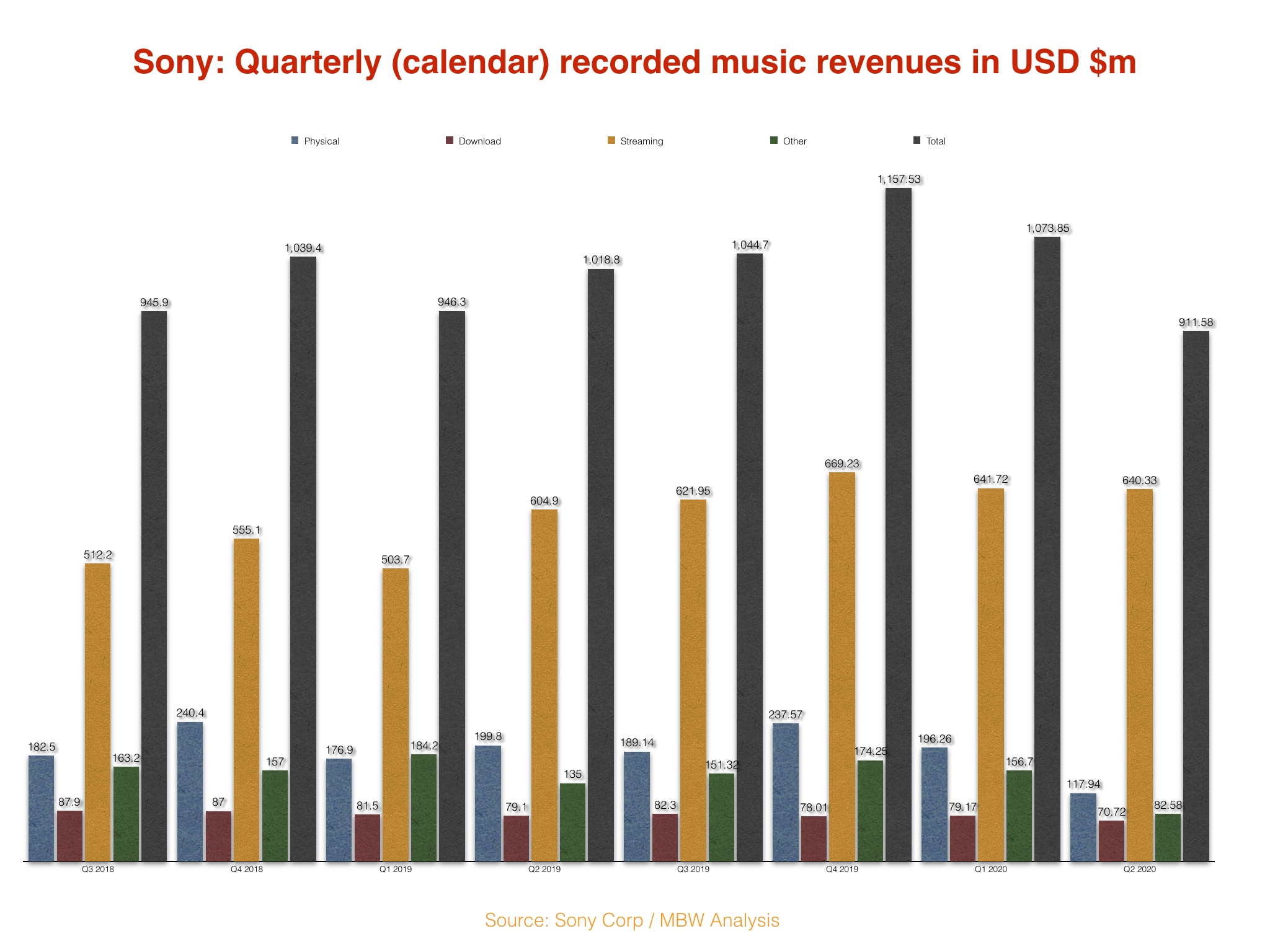 As a result, Sony’s streaming gains weren’t quite enough to offset its declines in other categories in calendar Q2. This resulted in total quarterly recorded music revenues of $911.6m, down 10.5% YoY.