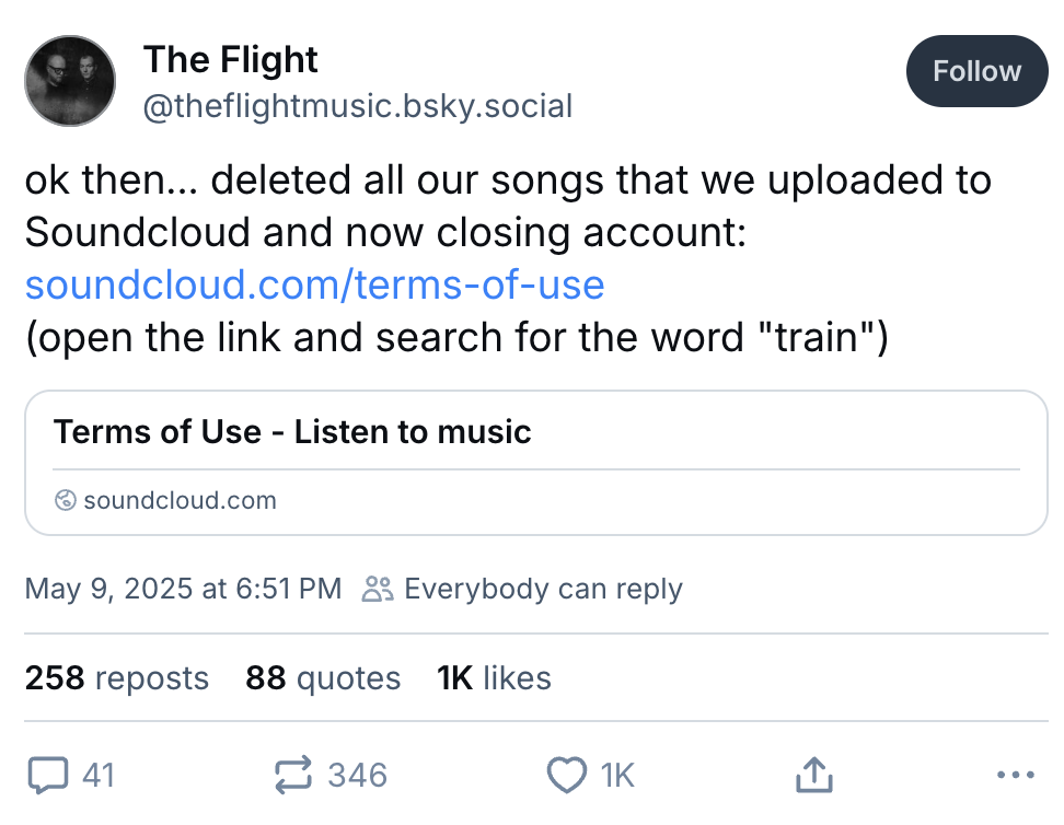In a post on Bluesky, the duo said: “ok then… deleted all our songs that we uploaded to Soundcloud and now closing account,” with a link to SoundCloud’s Terms of Use.