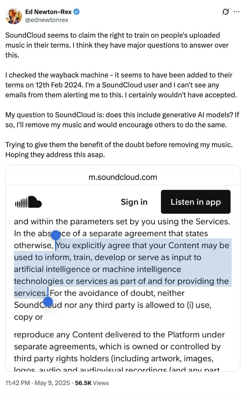 “SoundCloud seems to claim the right to train on people’s uploaded music in their terms. I think they have major questions to answer over this,” Ed Newton-Rex said in a post on X on Friday (May 9).