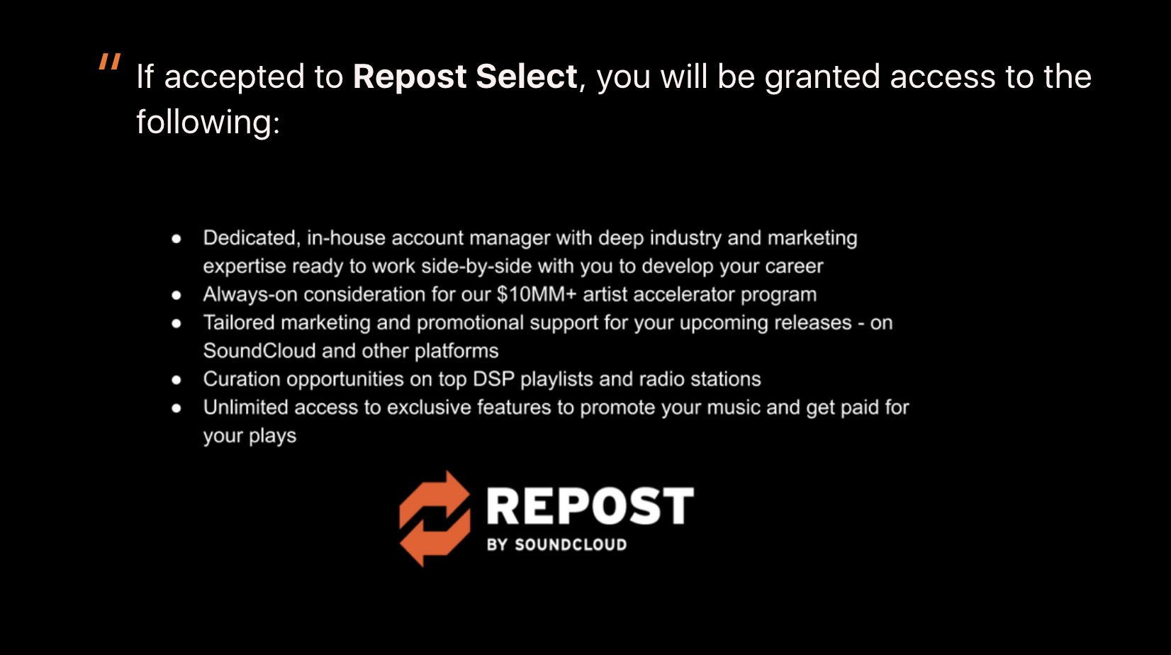 SoundCloud explains that Repost Select, which artists can apply for here, is “for professional artists who want to unlock their potential and take their music full time”.