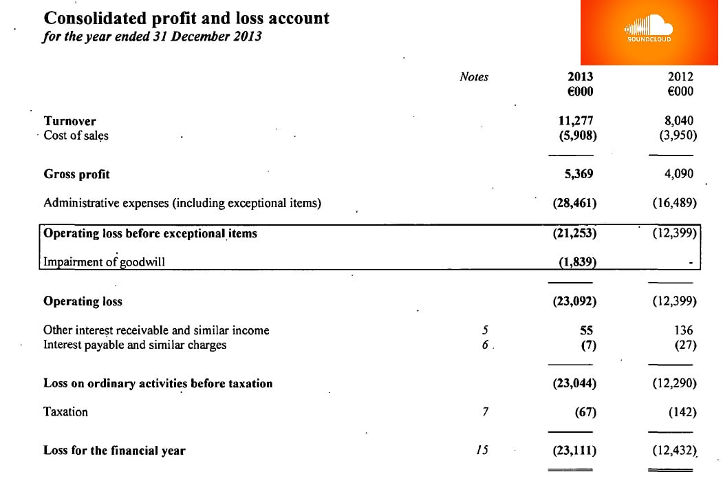 Focus, if you will, on the number regarding ‘administrative expenses’ below in SoundCloud’s 2013 accounts.
