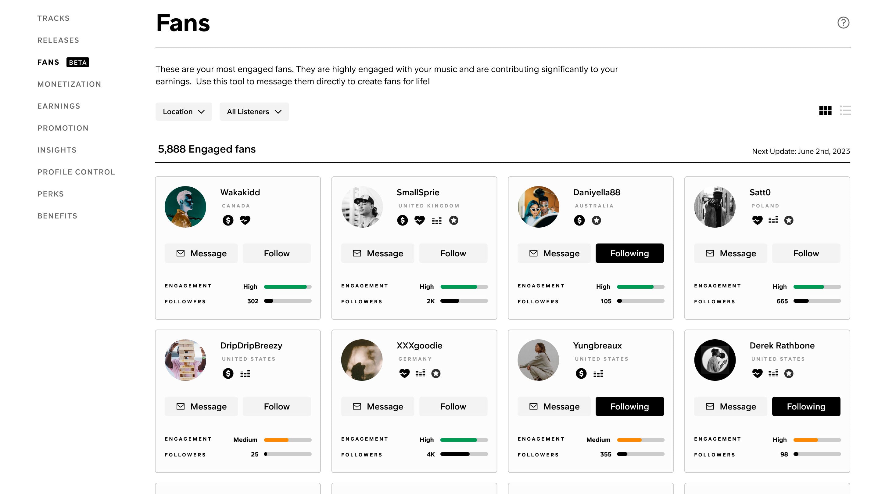 Artists can also sort fans by listener versus artist to “discover potential collaborators”, and by location (by country only).