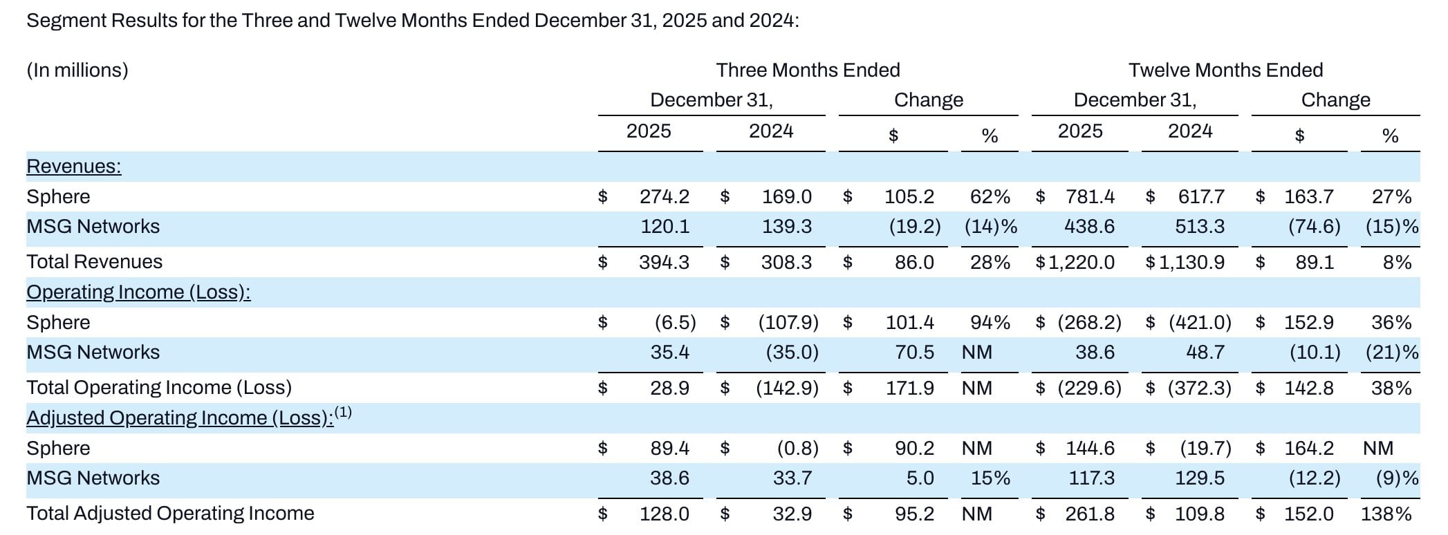 Sphere Entertainment reported an annual operating loss of $229.6 million for the 12-month period ending December 31, 2025, an improvement on the $372.3 million loss in the prior-year period.
