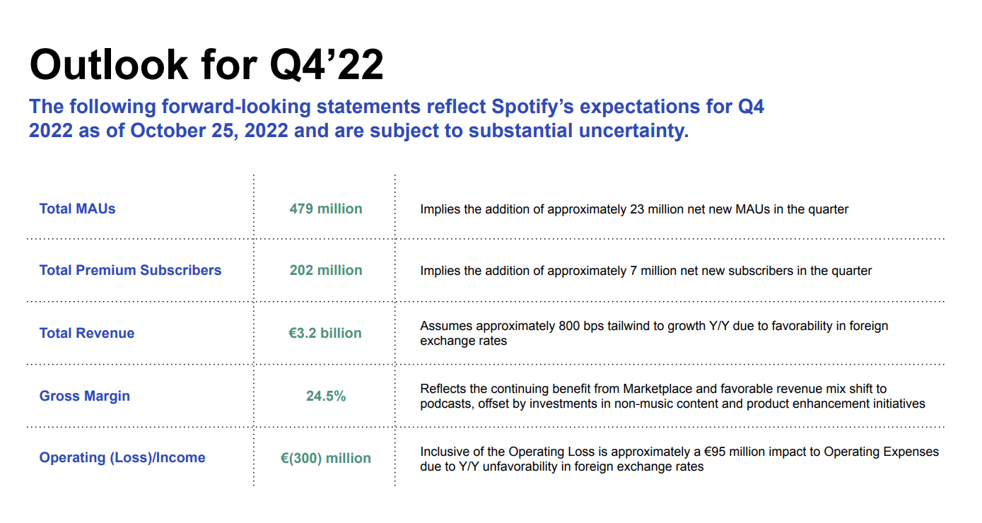 Spotify also provided some forecasts for Q4 2022 (the three months to end of December) today.