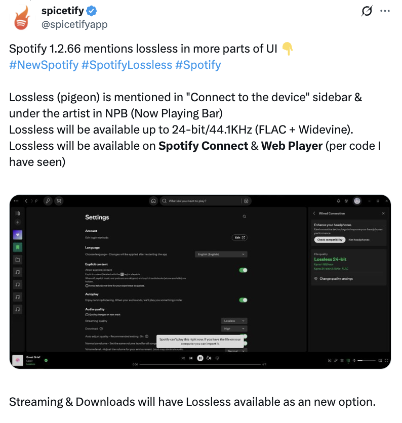 Screenshots shared by Spicetify on X show “lossless” appearing as a streaming quality option in Spotify’s settings menu. Additional references appeared in the “Connect to the device” sidebar and under the artist in the “Now Playing Bar.”