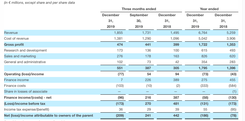 Spotify posted a quarterly operating loss in Q4 (the three months to end of December 2019) of €77m, and of €73m for the full calendar year.