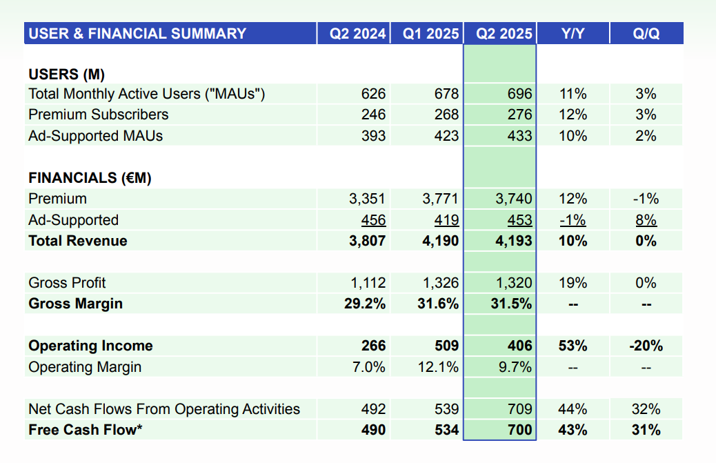 That was up +18 million MAUs from the 678 million reported for the prior quarter (Q1 2025), and above guidance by 7 million (Spotify forecast that it would reach 689 million MAUs in Q2).