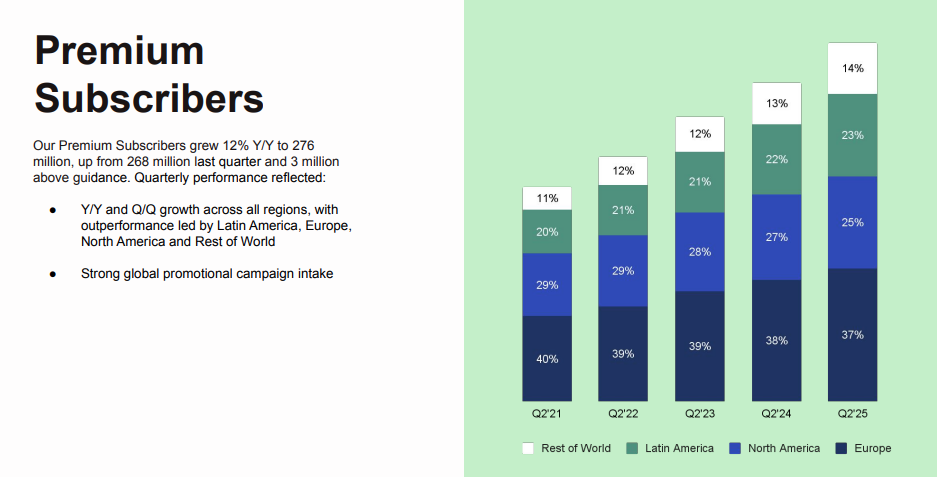 Spotify reported that this Premium Subscriber performance was fuelled by “Q/Q and Y/Y growth across all regions, with outperformance led by Latin America, Europe, North America and Rest of World” plus “strong global promotional campaign intake”.