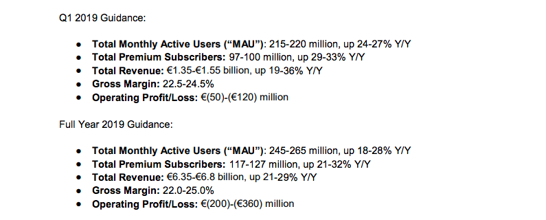 Spotify suggests that its annual revenues will land between €6.35bn and €6.8bn in 2019, with a projected annual operating loss between €200m and €360m.