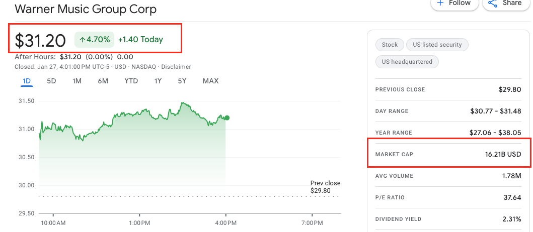 The share price of UMG’s rival Warner Music Group, which trades on the Nasdaq in the US, was up by 4.70% at today’s trading close vs. the trading close on Friday (January 24).