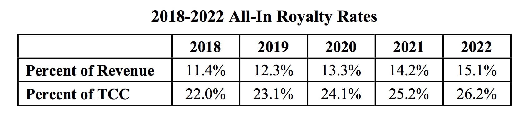 However, complicating matters a bit, the CRB also ruled that each streaming services would either have to pay songwriters this headline rate, or, if it resulted in a higher figure, up to 26.2% of their “Total Content Costs” across records and publishing (see ‘TCC’ above).