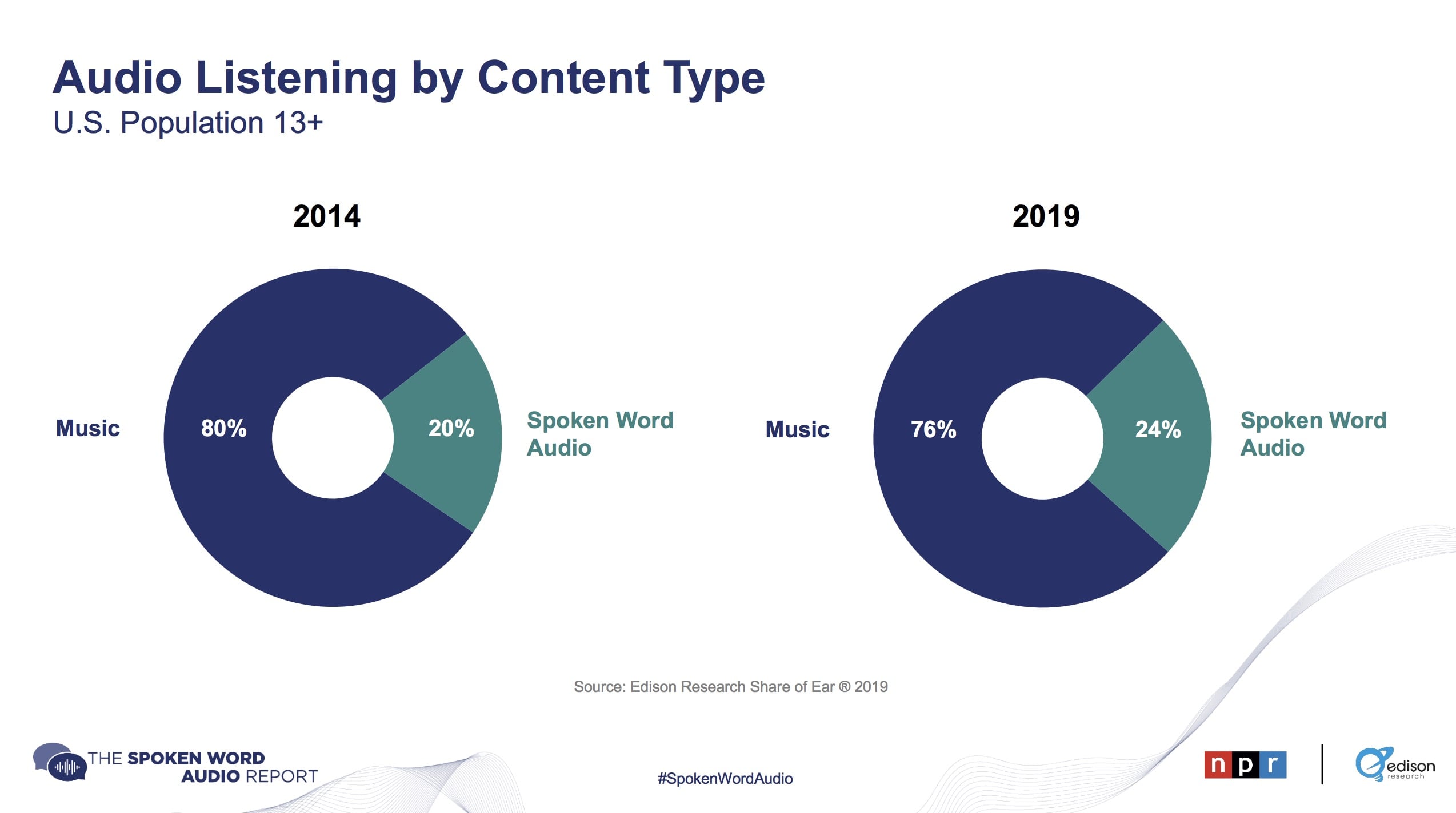 The highlights: a recent surey from Edison Research showed that, in 2014, 80% of the US population’s listening hours were dedicated to music, with 20% going to spoken word.