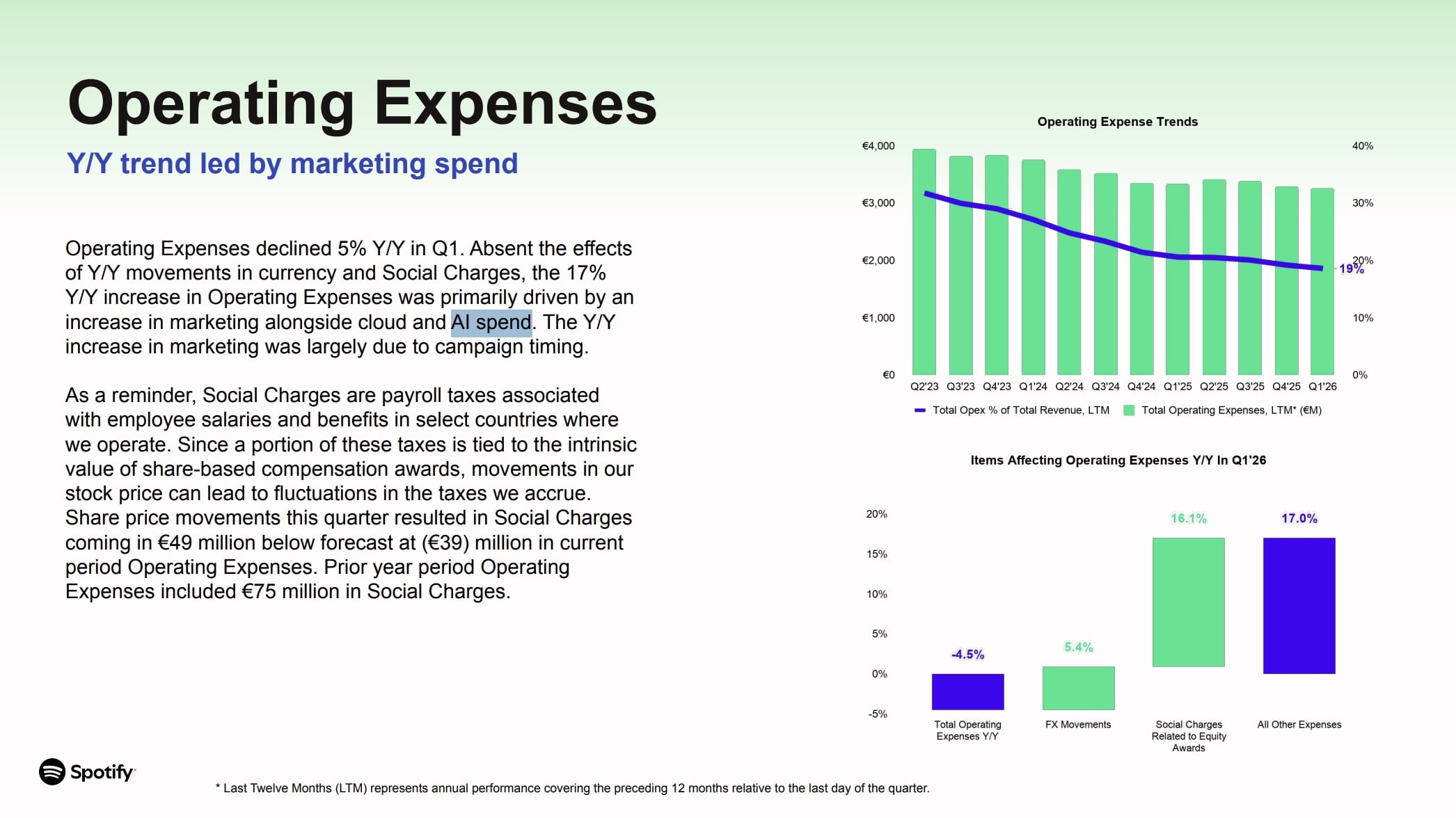 Spotify’s shareholder deck revealed that cloud and AI spend was one of the key drivers of a 17% underlying year-over-year increase in operating expenses in Q1 (alongside higher marketing costs). The reported figure showed operating expenses declining 5% YoY to €780 million, but that was flattered by currency movements and a €49 million social charges benefit.