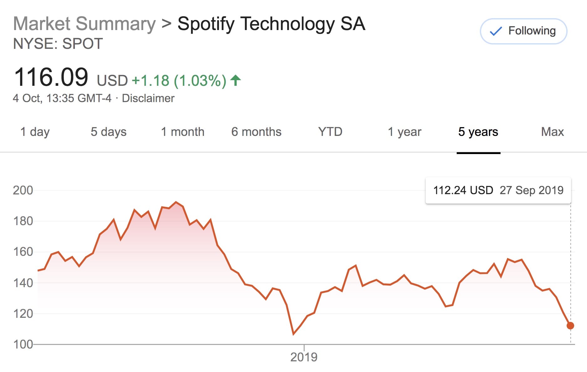 If you hadn’t noticed, SPOT’s share price has been taking a kicking of late. At the close of the NYSE yesterday (October 3), it stood at $114.82, representing a company-wide market cap value of $20.64bn.