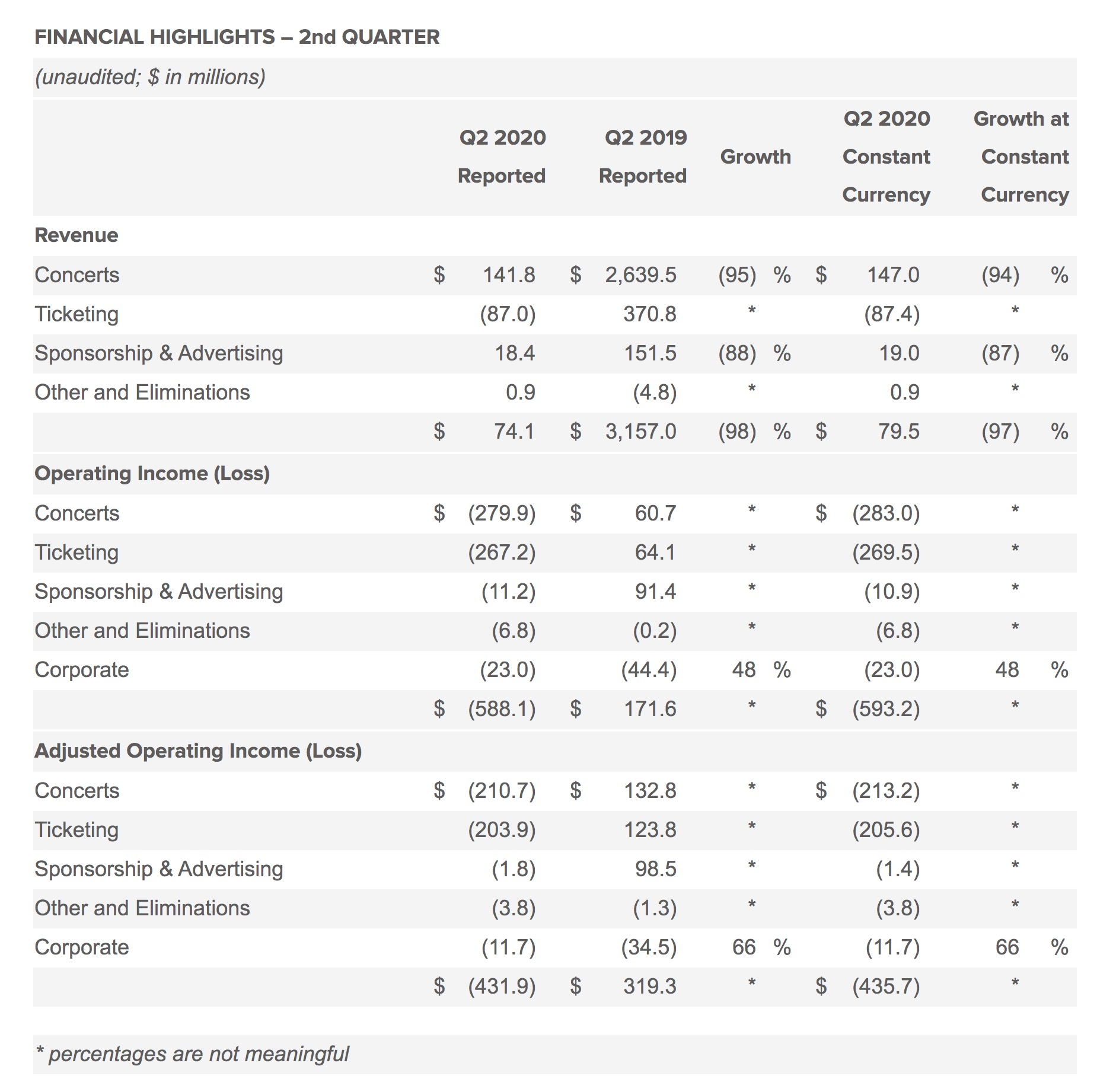 The most sobering line in Live Nation’s Q2 shareholder letter? “We estimate the lost revenue impact from the global COVID-19 pandemic in the second quarter and first six months of 2020 to be approximately $2.9 billion and $3.3 billion, respectively.”