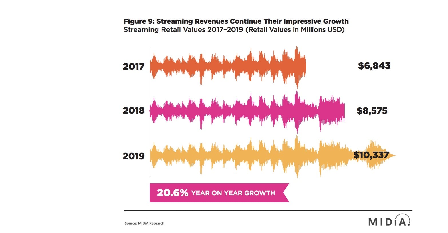 Created in conjunction with Midia Research, the report reveals that in 2019, digital services saw US consumer spend on music streaming subscriptions hit $6.93bn, up 25.2% year-on-year.