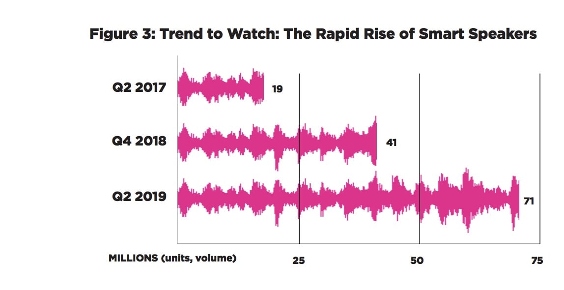 According to Streaming Forward, there were 71 million owned smart speakers in the United States at the close of Q2 2019, a number which had almost quadrupled in just two years.