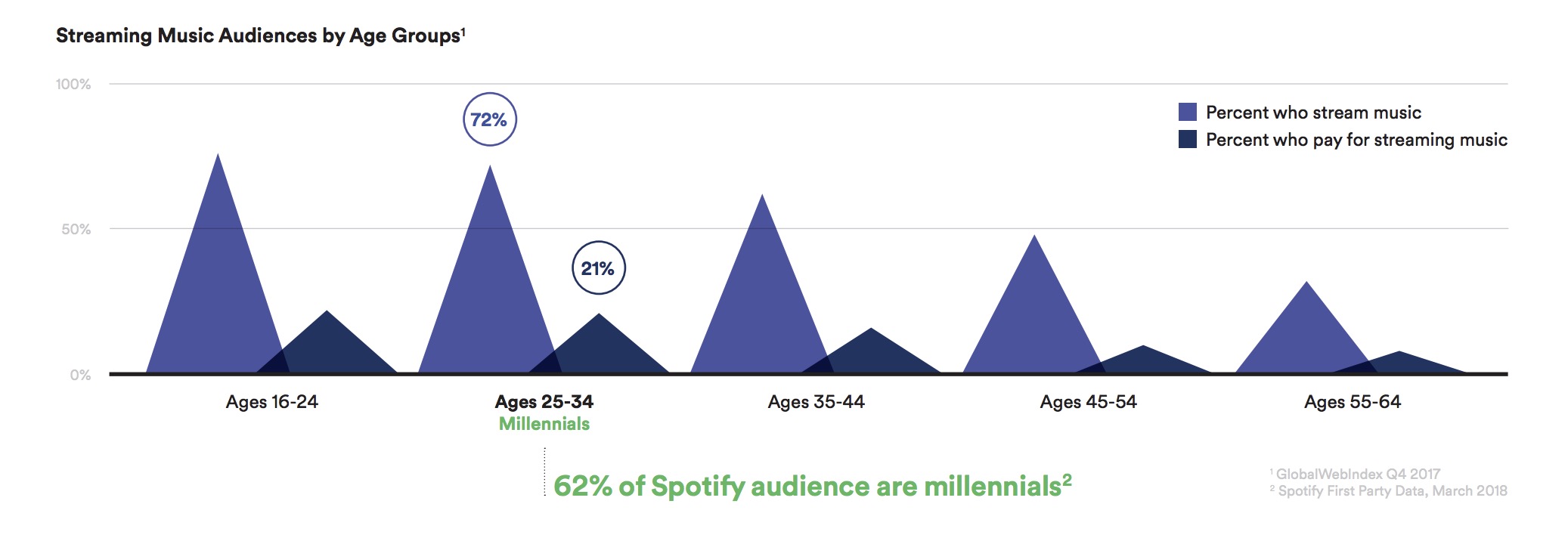 Indeed, Spotify’s own data in Q1 2018 showed that 62% of its audience were ‘Millennials’, defined as those aged between 25 and 34 – a stat which didn’t even include those aged 24 or younger.