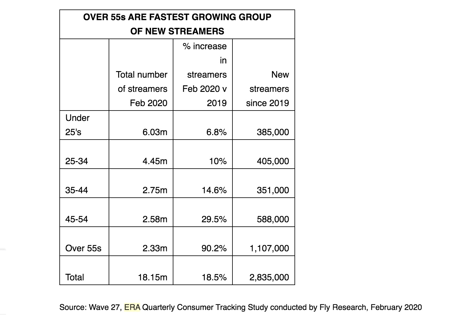 There’s no certainty that this outcome will happen in 2021 and 2022, of course, although ERA itself concludes from its recent research that “as [UK streaming] penetration begins to plateau in the younger age groups, the growth rate is accelerating in the older age groups”.