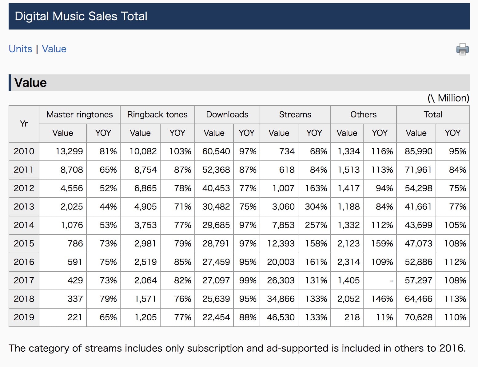 Indeed, audio streaming revenues in Japan nearly doubled just in the two years between 2017 (23.89bn Yen) and 2019 (41.97bn).