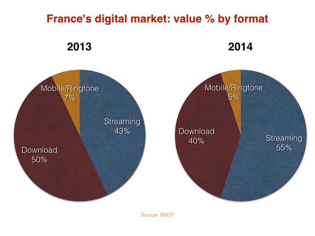 The recorded music market in France dropped 5.3% in 2014, despite streaming overtaking downloads as the country’s main source of digital revenue.