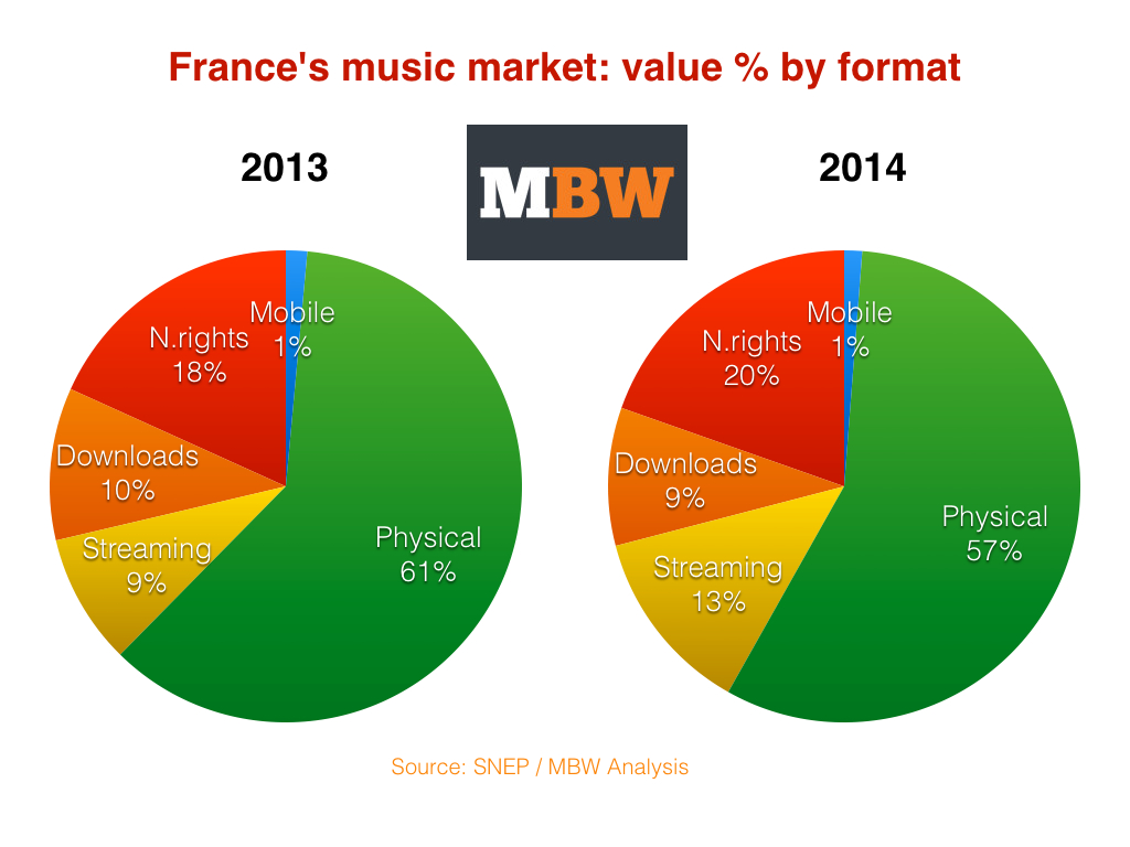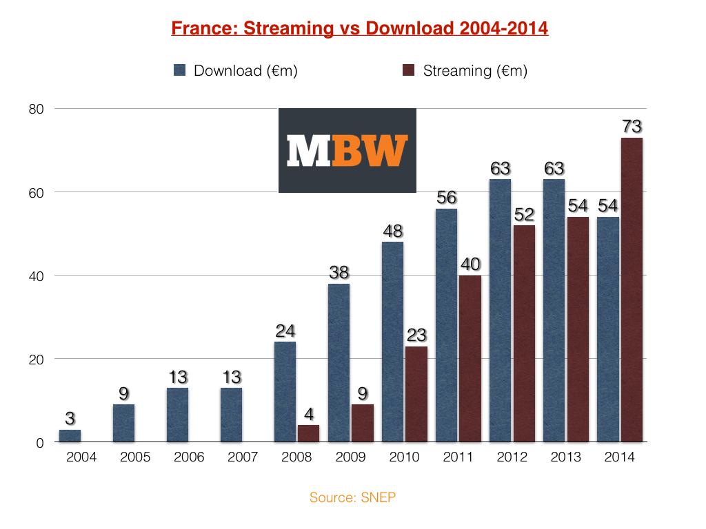 As you can see in MBW’s graphs below, streaming now accounts for 55% of France’s digital market.