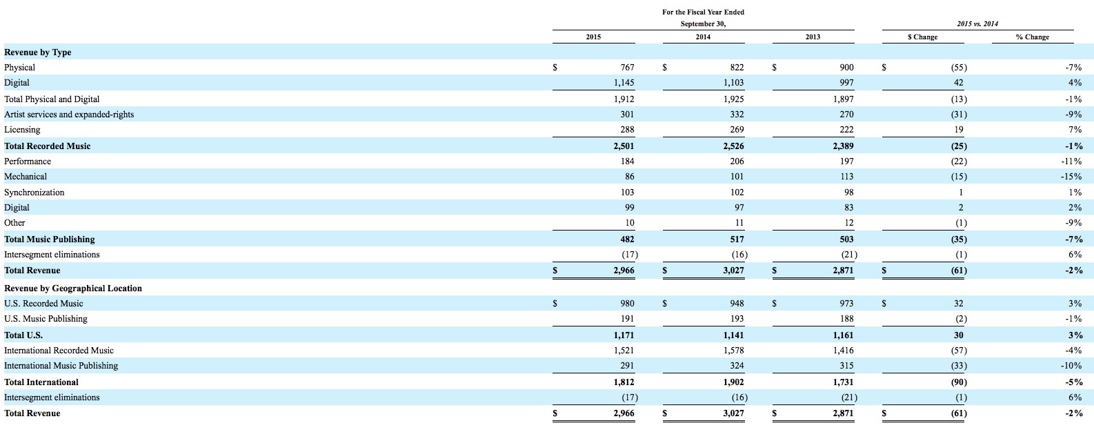 WMG’s recorded music revenue increased by $168m, or 7%, to $2.501bn in FY 2015 at constant currency – but was down 1% in actual terms.