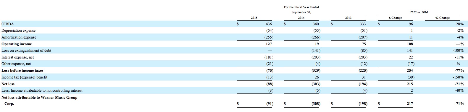 Over at Warner/Chappell Music Publishing revenues decreased by $35 million, or 7%, to $482 million for the fiscal year ended September 30, 2015 from $517 million for the fiscal year ended September 30, 2014.
