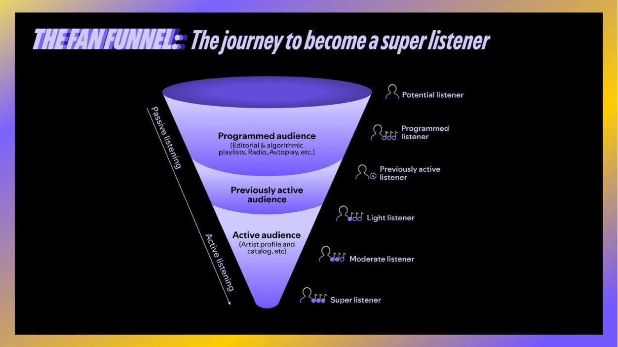 Spotify has devised a “fan funnel” to help artists visualize how to move listeners from being “passive” fans to “active” fans, and identified three stages, each one requiring a strategy of its own: