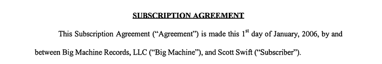 MBW has obtained a subscription agreement between Big Machine Records LLC and Scott Swift, dated January 1, 2006, which grants Mr. Swift 416,666 common shares in the company plus 500,000 preferred shares, for a total price of USD $500,416.66.
