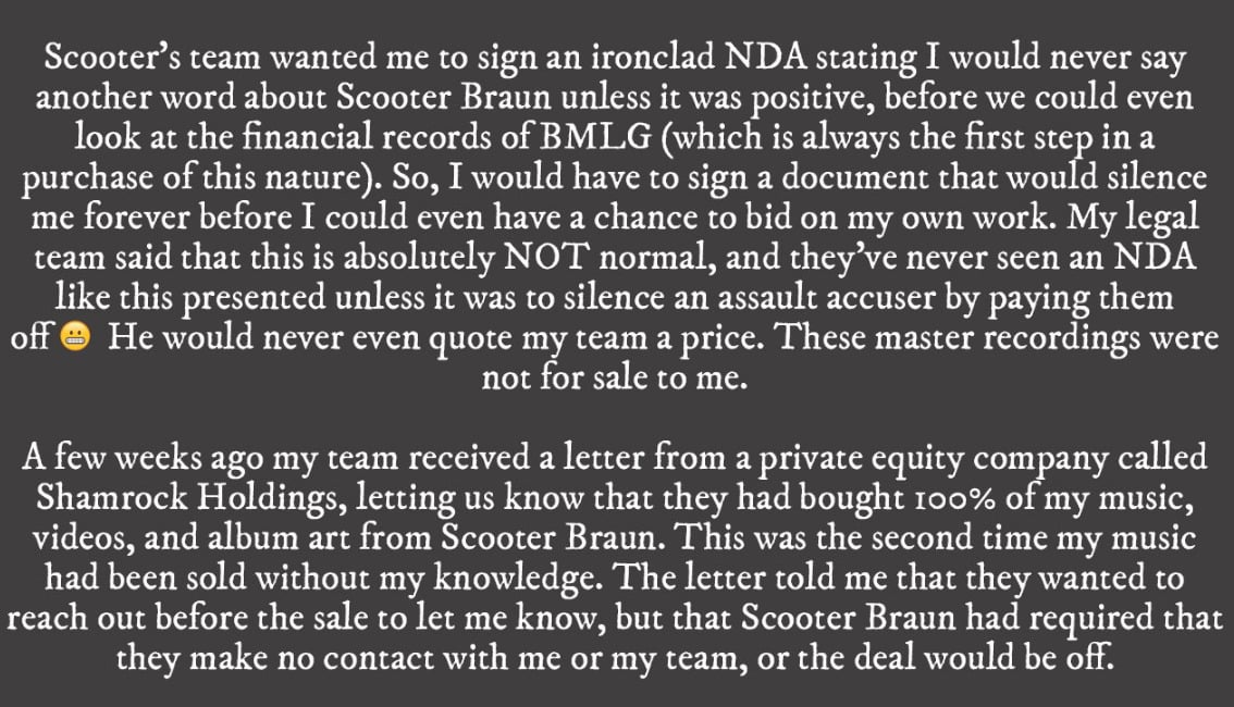 A section of Taylor Swift’s social media post RE: Ithaca Holdings selling her ‘Big Machine’ catalog to Shamrock – November 2020
