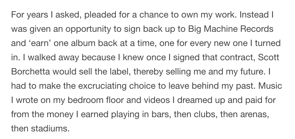 Swift acknowledged in her blog that Borchetta and Big Machine had offered her this chance. But she alleged that they did so on an unacceptable condition: that she “earn” back the rights to each of her first six albums, one by one, for every new album she recorded for Big Machine.