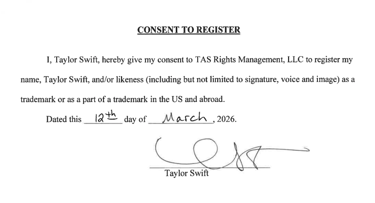 Swift’s trademark applications, submitted to the US Patent and Trademark Office on Friday (April 24), list TAS Rights Management, LLC, a Tennessee-based entity, as the owner. The filings also include a signed consent from Taylor Swift to register her “likeness (including but not limited to signature, voice and image) as a trademark or as a part of a trademark in the US and abroad.”