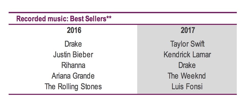 Within Universal’s year-end 2017 figures, issued last week, Vivendi notes which artists generated the most revenue for UMG’s labels in the year.