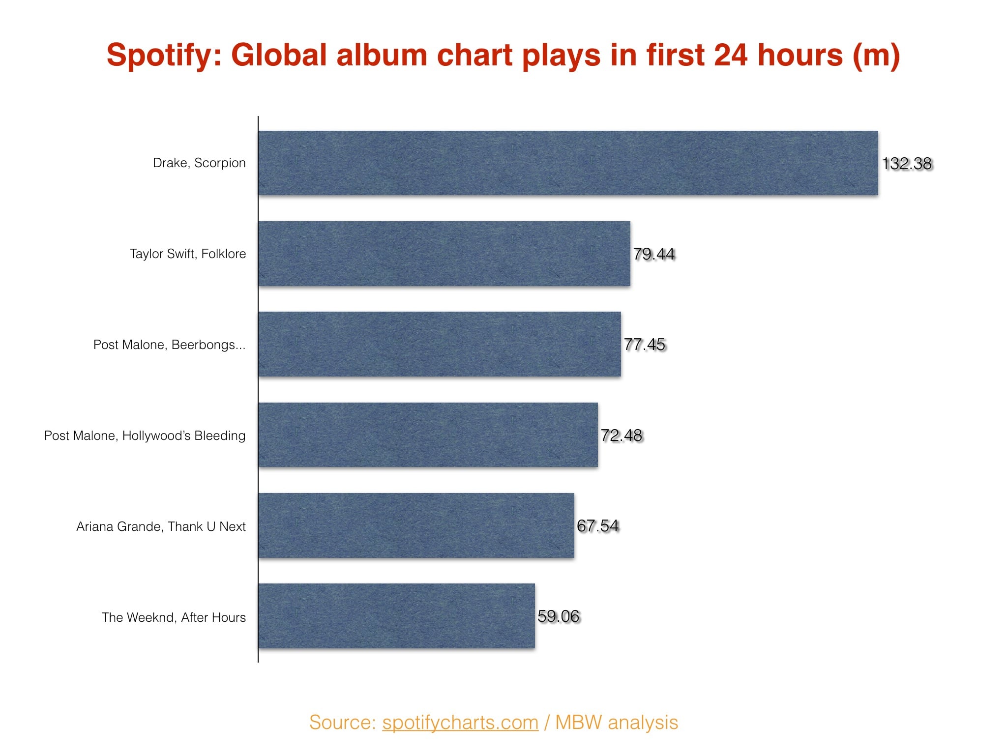 According to MBW’s calculations, Folklore just became the second-biggest album debut of all time on Spotify, behind Drake’s Scorpion.