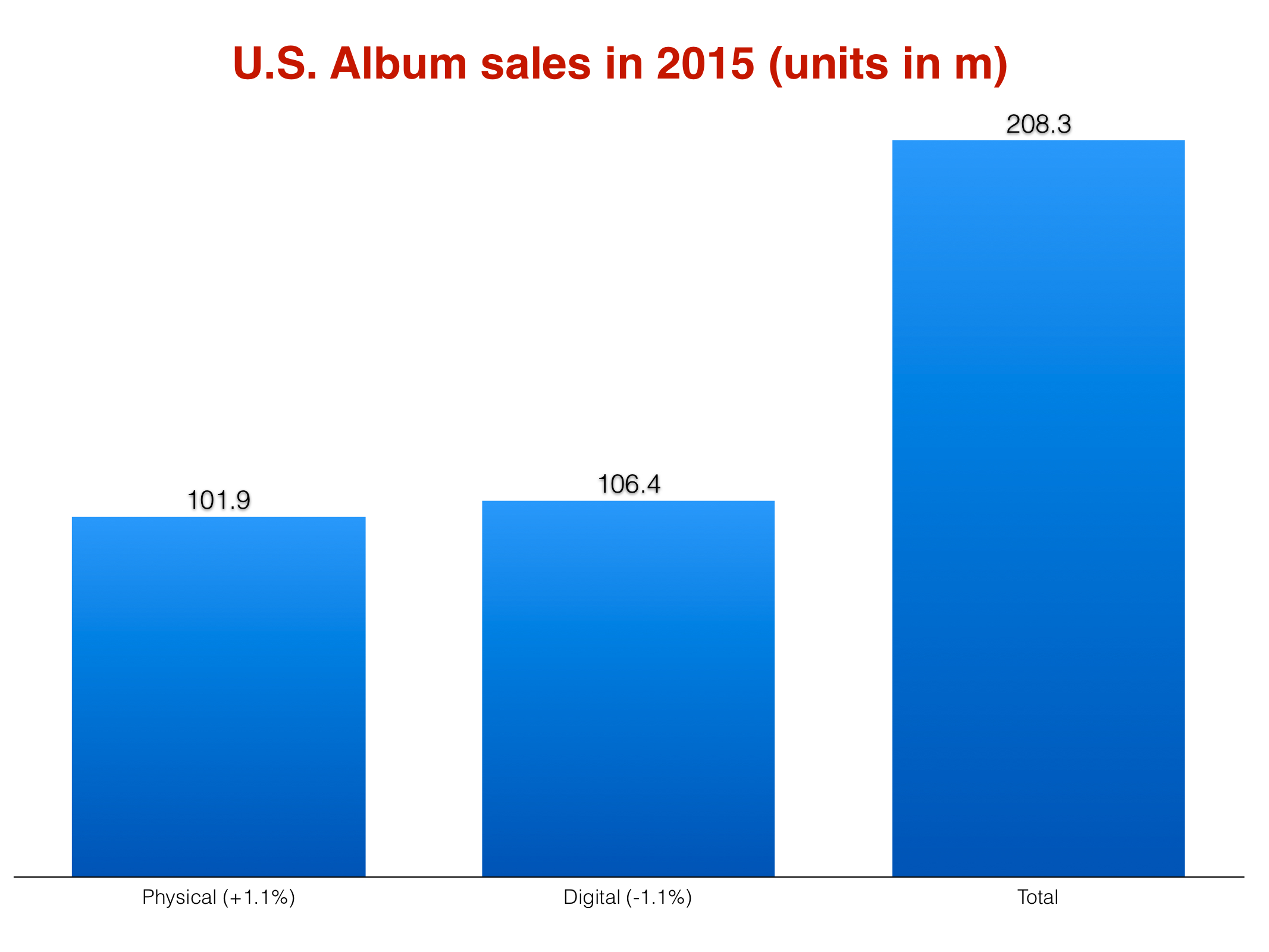 First, the surprise news: according to BuzzAngle’s data, total album sales (in unit terms) were flat in the US last year, at 208.3m.