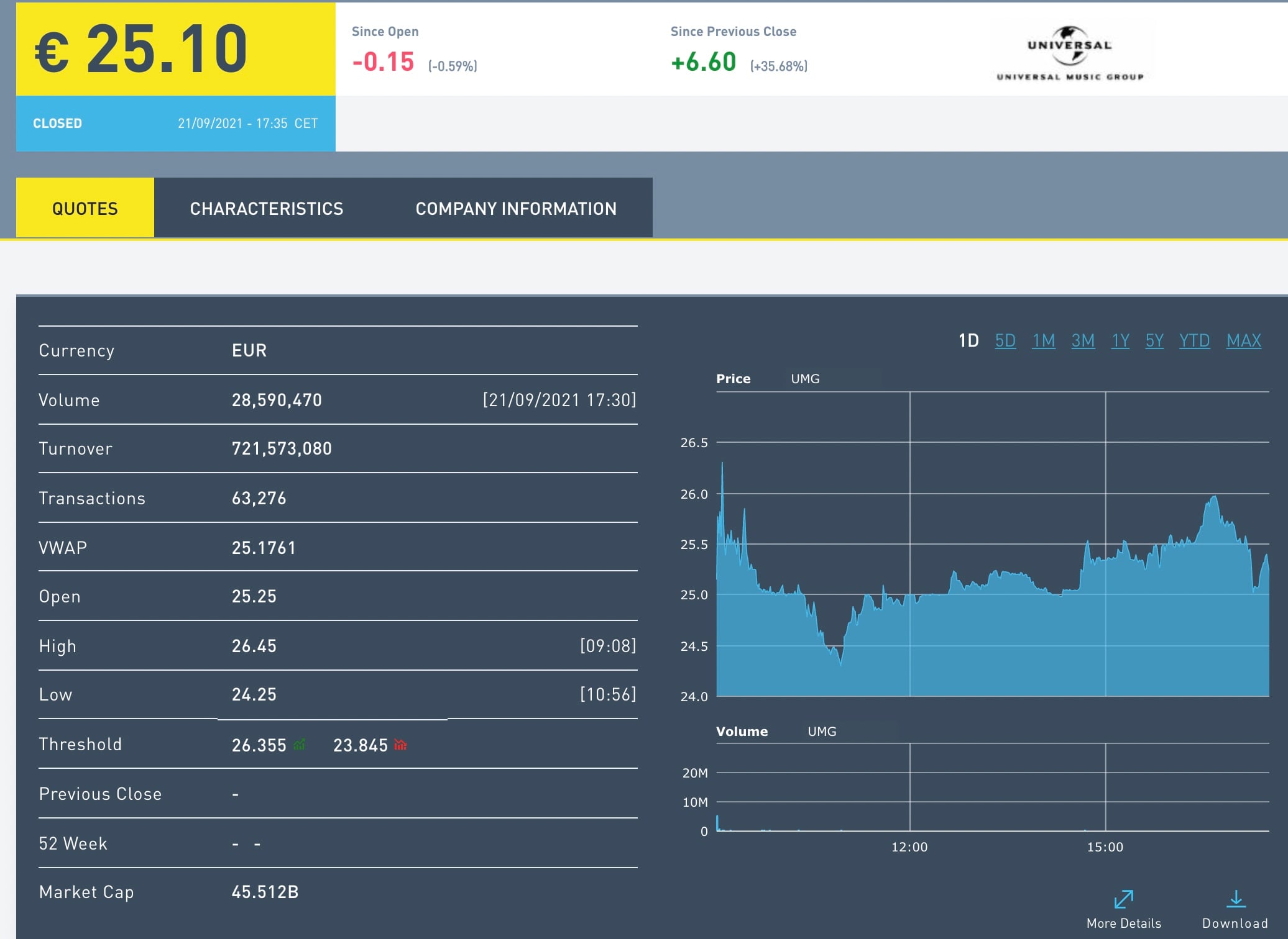 UMG’s shares hit a peak of €26.45 ($31) during the day, and closed at €25.10 ($29.43), which translates to a valuation of €45.5 billion or $53.3 billion after the company’s first full day of trading (see below).