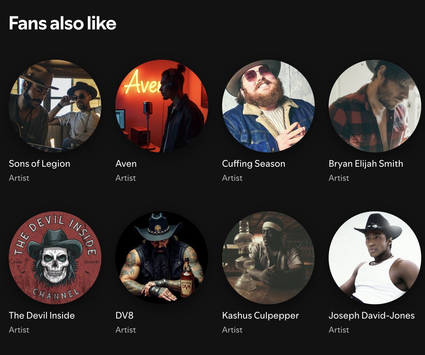 Once I started listening to Aventhis, Spotify soon recommended another AI artist, also in the ‘outlaw country’ field, and likely created with Suno or Udio.