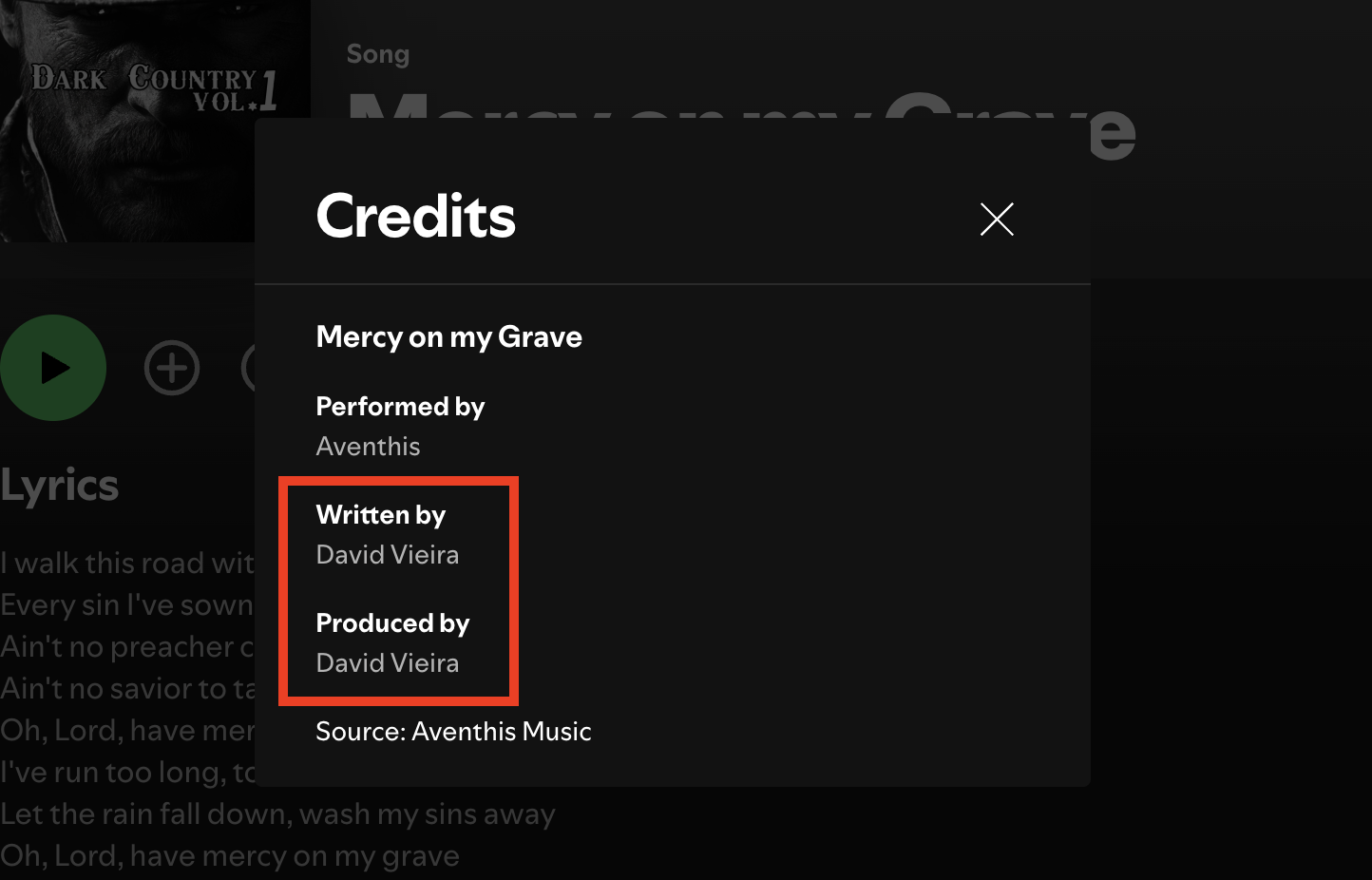 I’d wager that, in this case, ‘me’ is really David Vieira – the man credited as the songwriter and producer behind Aventhis’ songs on Spotify (see below).