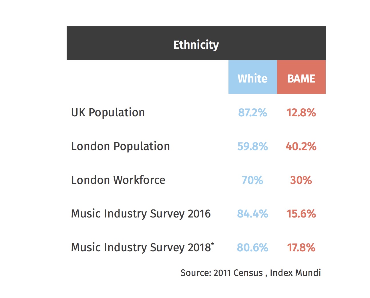 According to a survey linked to a 2018 Diversity Report created by UK Music, BAME [Black, Asian and Minority Ethnic individuals] represented just 17.8% of the British music industry, with white people dominating employment with 80.6% of roles. And according to the Office For National Statistics Census survey from 2011 (as cited in the UK Music report), only 12.8% of the wider UK population was non-white, yet in London and the South East, where the majority of the British music industry operates, BAME individuals made up 30% of the workforce.