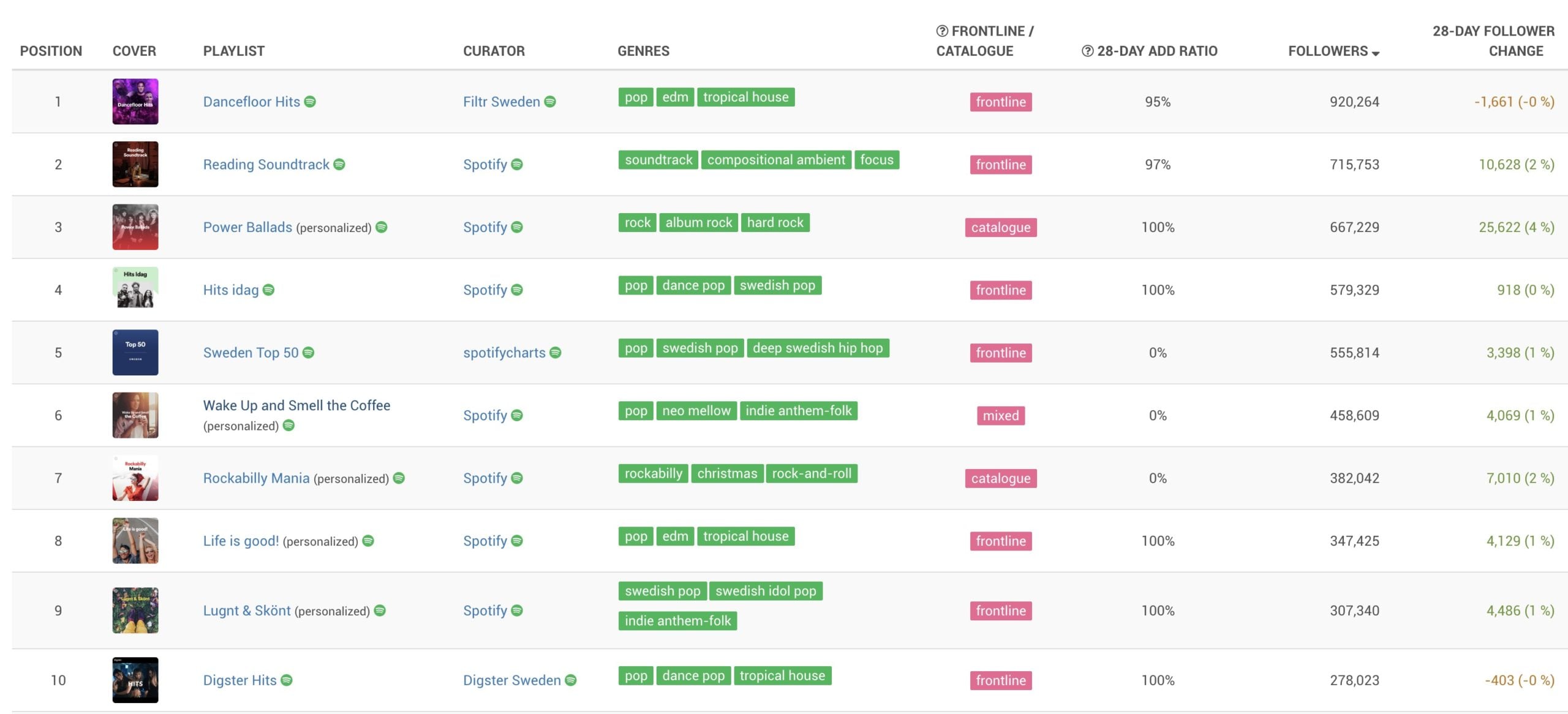 Meanwhile, in the past month, all five of the most popular major-label owned playlists on Spotify in Sweden have lost followers.