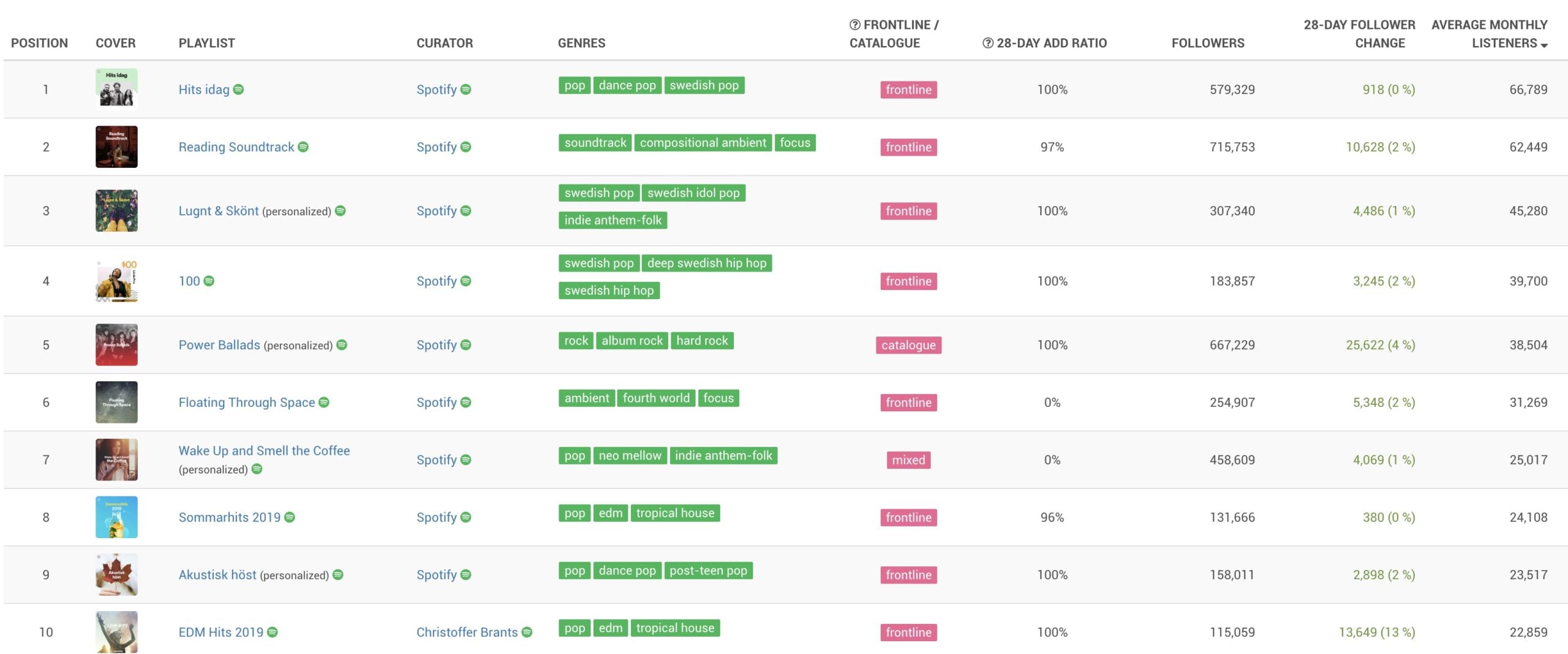 Interestingly, these two playlists perform especially well when Spotify’s playlists in Sweden are ranked in terms of Average Monthly Listeners (AML), as opposed to followers (which some argue is a misleading metric).