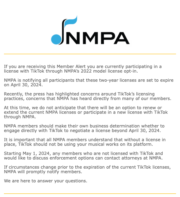 “Starting May 1, 2024, any members who are not licensed with TikTok and would like to discuss enforcement options can contact attorneys at NMPA.”