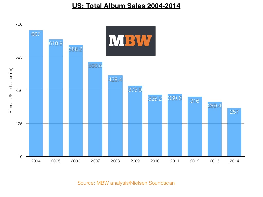 Billboard has released some new Soundscan stats for last year that complete the decade’s sorry picture, showing that total album sales fell 11% year-on-year in 2014, down to 257m versus 289.4m in 2013.